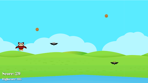 Mr Owl is hungry and wants some chocolate chip cookies! However there are some evil bats in his way and Mr Owl needs your help to avoid them. Also watch out for the water, Mr Owl does not like water!