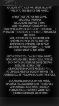 After the game began, Mr. Skull Trumpet will create sounds that will fall precipitously. when note will be in the center of the circle, press on the screen. If the note falls on the right side, then click on the right side screen. If left, click on the left. For every successful hit in time you will receive points that can be spent in the store.