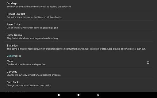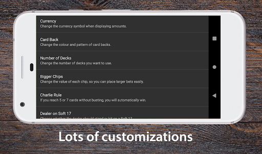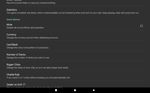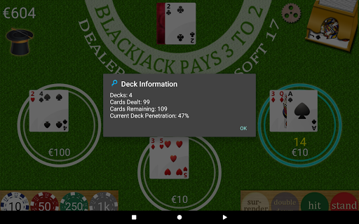 Gives many more options than most other blackjack games, like choosing the number of decks you want and whether the house stays on soft 17s. I wish I could be able to choose my stake amounts though. Over all the best I've found!
