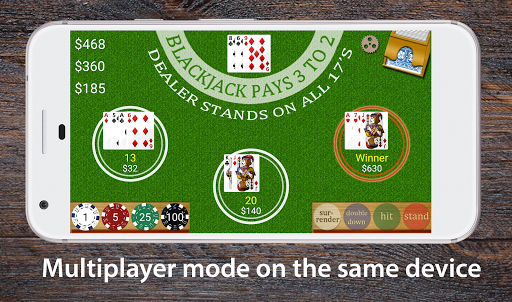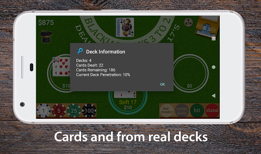 This game uses real cards from 1 to 8 decks (can be configured in settings). It's a great way to practice your strategy, or enjoy some couch time with friends using the local multiplayer mode.