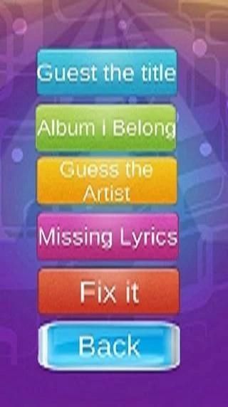 A game that features different songs in different genre with different game types. Functions as a mini Karaoke in mobile, featuring 5 levels of game, from the first level Guess the Title, Guess the album, Guess the Artist, Guess the missing lyrics and Fix It.
