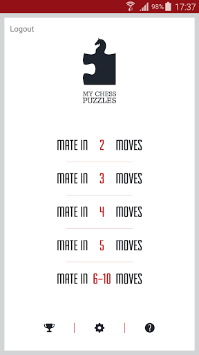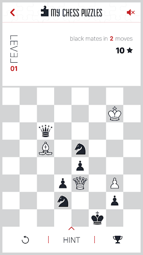 My Chess Puzzles (Chess Tactics) includes over 10.000 interactive chess problems ranging from mate in 2 moves all the way to mate in 10 moves! The object is to finish each puzzle by forcing a checkmate in a given number of moves.