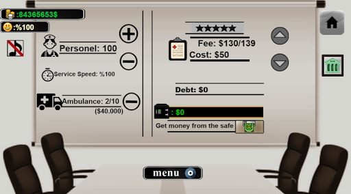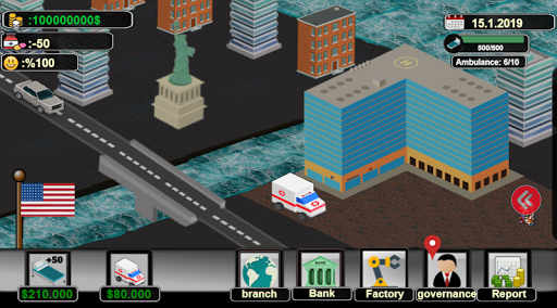 You can make the hospital 3 floors with the profit you will make from the trade and open new branches in other countries. In the management room, you can hire the best staff and doctors for your company. The maximum ambulance fleet will increase your monthly income. To gain reputation, you must pay customer complaints, taxes, and technical service costs. If you do not pay the salaries of the employees on time, service speed and patient satisfaction will decrease. Become a good manager by managing the finest health department finances.