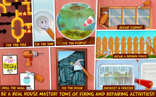 Second is Fixing and Repairing, Each room is packed with tons of real-life fixing activities. Fix kitchen cabinet doors, fix the fence in the garden, Fix the water pipe by solving jigsaw puzzle, Door fixing, Fill the fridge with fresh food, Add some groceries in kitchen cupboard, Arrange kitchen with all the kitchen essentials, Fill the freezer with ice creams and candies, Drill the wall in Bedroom, Like a real housemaster, you will have to fix it all using hammer and nails, a screwdriver and an electric drill.