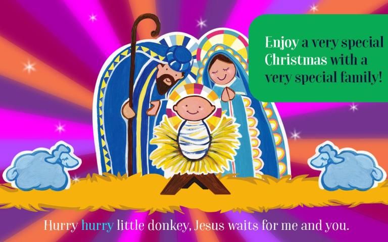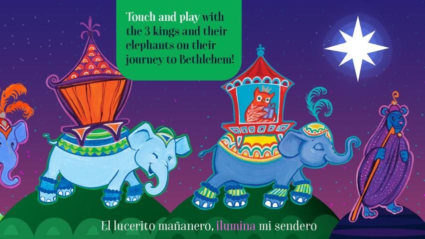 The app stars a charming donkey and his rider, a little chick named Ricky Chicky who trot across the screen on their way to Bethlehem, accompanied by other charming characters from the Canticos collection of Spanish nursery songs. The parade of colorful characters through the savannah, bearing gifts and musical surprises, makes for a whimsical journey with a magical ending when they meet the Holy Family and Baby Jesus.