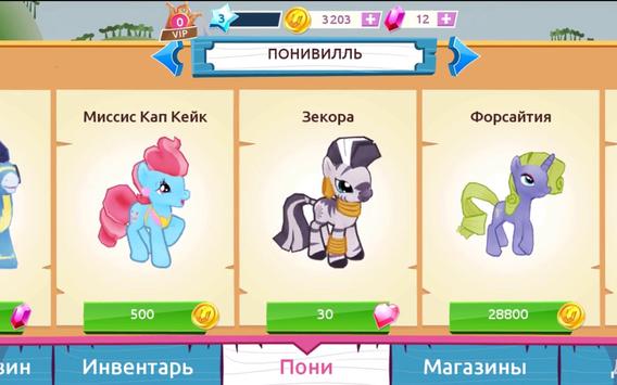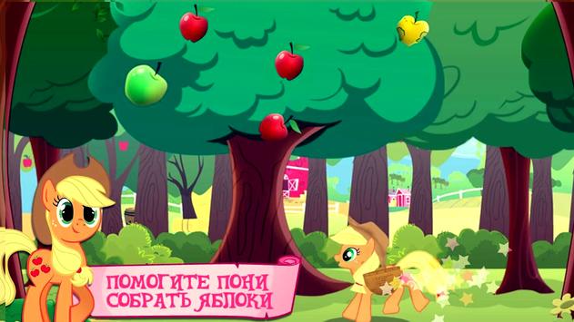 My Little Pony: Friends game based on the homonymous multi-series for mobile devices and tablets with the operating system iOS and Android. In the beginning, an empty site is located under the control of the player - the town of Ponyville, where there is only a house with a pony named Twilight Sparkle (Twilight Sparkle). The player must buy new stores and ponies in which they will work and thus earn money, which can be further bought by ponies and shops. Each pony is bought with the house. The goal of the player is to build up the territory with houses with ponies and shops, and also to expand the territory. You can also build paths and scenery for the street. In order for ponies to work on their debts in stores and thus bring in large profits, it is necessary to receive the stars that are obtained by playing with them in mini-games: playing with the ball, searching for constellations and picking apples.