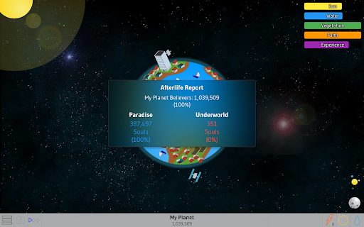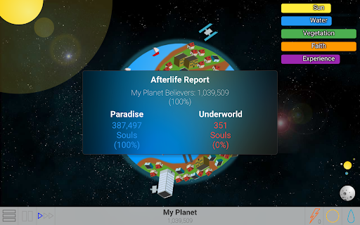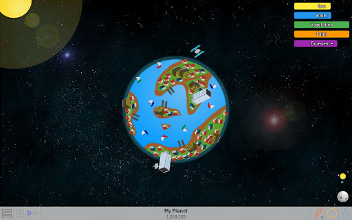 My Planet runs in real time, even when the the game is closed. Therefore, you must keep checking back throughout the day to make sure your planet is running at optimal levels. The controls are simple to use, by mastery can take weeks. Can you achieve the ultimate goal of growing your planet to over 1,000,000 people? Or will your planet burn under the sun while your people anguish? The choice is yours!