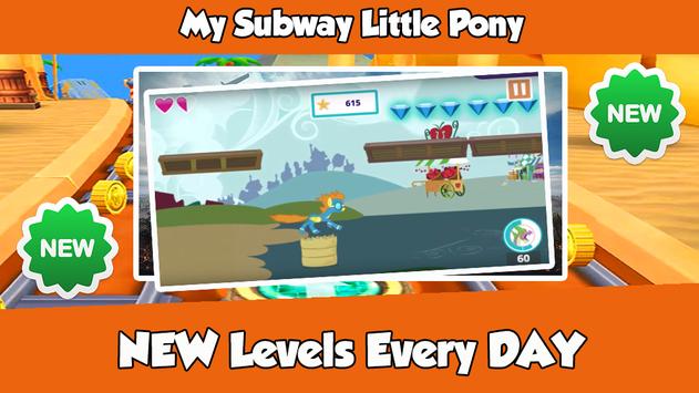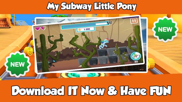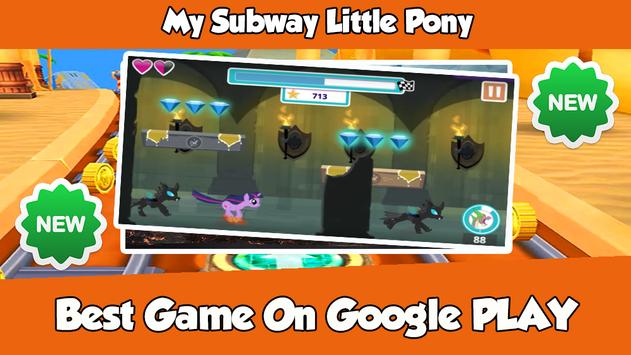 If you're looking for a fun game!, this will be the best choice to you My Subway Little Pony is an adventure running and jumping princess game on subwa , try to help our hero pony to win This Little Unicorn game is so easy, simple and super entertainment.