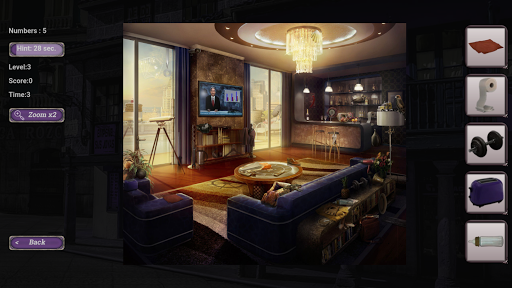 Incredibly involving and mysterious story of a mystery hotel will take you through unforgettable gaming journey. Just search hidden objects in hotel. Finding required objects let you solve the mystery of the mystery hotel.