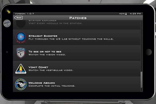 Collect mission patches for completing tasks, counteracting the effects of microgravity, and making discoveries.