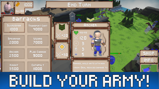 Utilizing every unique unit type is the key to victory, Swordsmen are the bread and butter of every army but struggle to weave through the terrain as well as the Spearman can. Archers, Catapults, Battleships and magic wielding mages can blast your enemies from a distance! Knights and vehicular units can travel greater distances and utilize roads much better than others. Using specific units for different situations is essential in achieving victory!