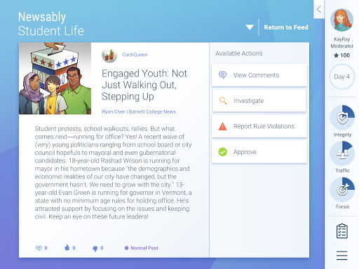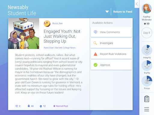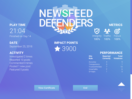NewsFeed Defenders is a challenging online game that engages players with the standards of journalism, showing you how to spot a variety of methods behind the viral deception we all face today. Join a fictional social media site focused on news and information, and meet the challenge to level up from guest user to site curator. This can only be achieved by spotting dubious posts that try to sneak in hidden ads, viral deception, and false reporting. In addition to maintaining a high-quality site, you are charged with growing traffic while keeping the posts on topic.