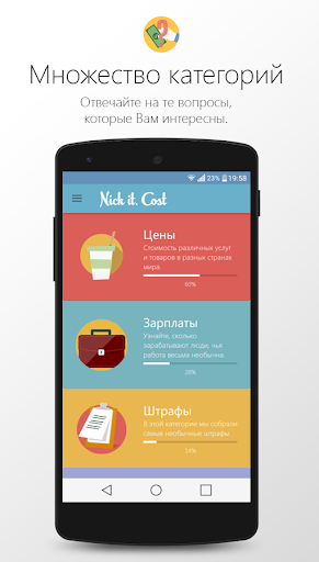 "Nick it. Cost" Вы можете проверить свою эрудированность и интуицию, угадывая стоимость различных услуг и товаров, зарплат и прочего в разных странах мира. С помощью "Nick it. Cost" Вы сможете скоротать досуг, а также узнать множество интересных фактов, связанных с деньгами и экономикой.