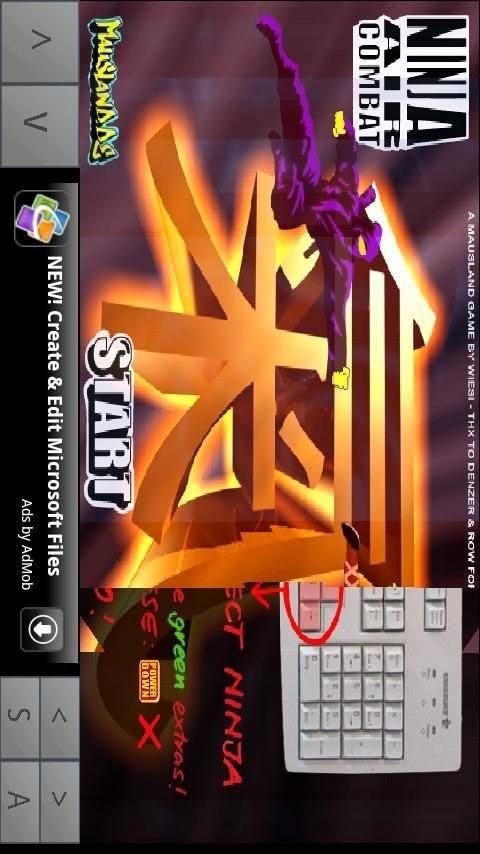 *REQUIRES FLASH 10.1 OR HIGHER* Combat enemies in the air as a ninja. CONTROLS: Up/Down: MOVE UP OR DOWN Left/Right: Speed up or slow down S: Space, & throw bombs. You only get four. A: Attack Check out quake3droid and quake2droid. Content rating: Everyone