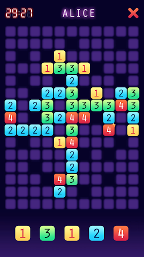 Start with a board that has 145 squares to play, 20 black holes and number 4 in the center. You get with five random pieces, numbered from 1 to 4 telling you how many sides you can connect to another piece. Take your turn to place your piece in a position with the right number of connections to other pieces. You have 30 seconds the make your move. Each played piece gets replaced by a random new one. Place the last possible piece on the board to win.