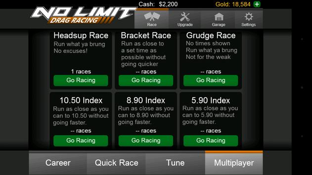 Play other racers from all over the world in online multiplayer play. There are three racing types in multiplayer - Bracket Racing, Heads Up Racing, and Grudge Racing. If you're not familiar with these please look them up before attempting a race! These races are TOUGH, and are wagered races. There is NO LIMIT to the amount you can win or lose on a multiplayer race. Are you all in?