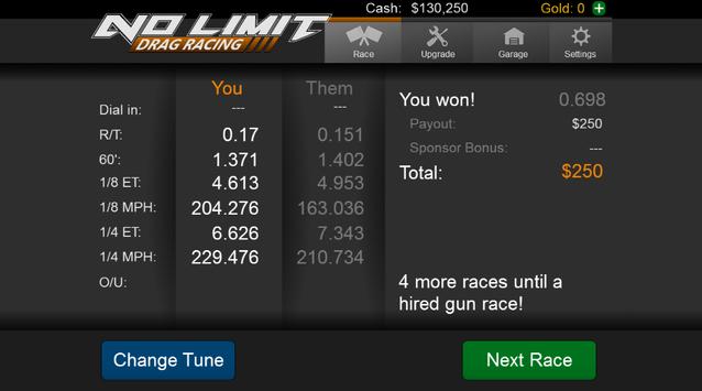In No Limit you get complete control over the gearing, rev limiter, suspension, and launch control of your car. Want to run a tall first gear with a short rear? You can! Want to launch on the limiter? You can! The tuning aspects are so in-depth that you can even adjust how high off the ground your wheelie bar is! Mess up your tune? No worries - just visit the mechanic and he will reset you to a base tune. No Limit also gives you an unlimited amount of Test-n-Tune races to make sure your car is the best it can be.