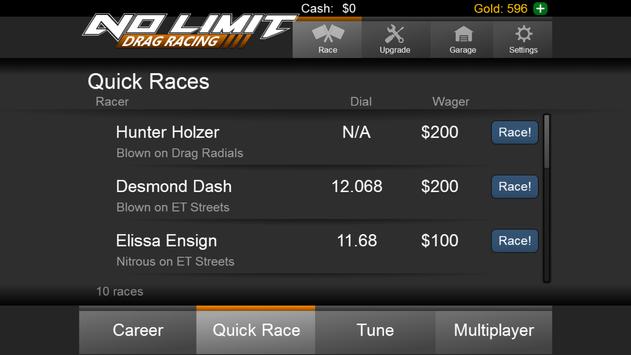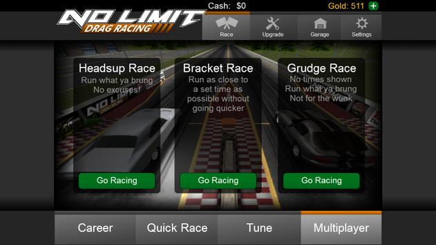 No Limit Drag Racing - the most realistic and engaging drag racing experience ever created for mobile devices - is finally here! Build, Race, and Tune your car until it's at the absolute peak of it's performance. Get your experience in career mode, then take it online and go up against the best of the best in online multiplayer play! This is no over produced side-scrolling pseudo racer. This is raw drag racing - NO FLUFF! - just you, your car, and your competitors.