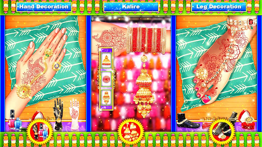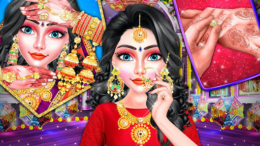 In this offline Indian fashion salon game, start with engagement, chat between couple, design kale like punjabi wedding salon, hand and leg henna mehendi designs and jewellery like bangles, anklets, rings, etc. for decoration, perfect wedding makeup treatments with hair design makeover in Indian Bridal Makeup Dress up Games. Prepare the Dulhan or Indian bride character for the royal wedding, Muslim wedding, or hijab wedding.