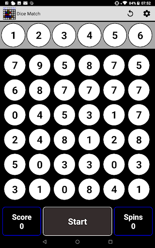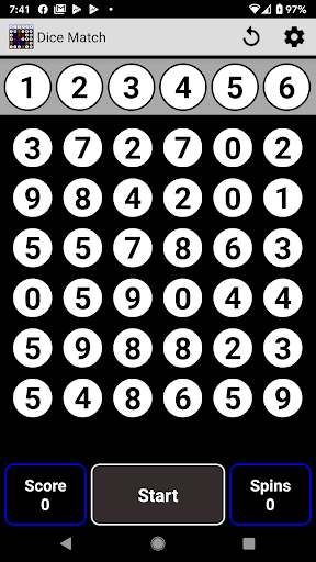 To begin, tap the Start button at the bottom of the game board. The dots across the top of the screen will spin in random order & generate a series of 6 random numbers. The numbers on the board that match the numbers spun will be highlighted a gold color.