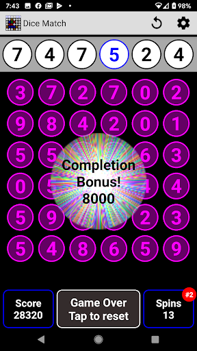 If you clear the board in less than 21 spins, you score a Completion Bonus of 1,000 points for every spin less than 21 - eg: if you clear the board in 18 spins, you score a 3,000 point bonus. You also score bonus points for clearing more than 1 number in a single turn & for completing rows, columns & diagonals.