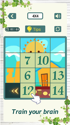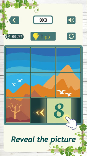 When the number block moves to its initial position, the block will automatically become a piece on a picture. When all the number blocks are restored to their original positions, the puzzle is solved and you can get a beautiful picture.