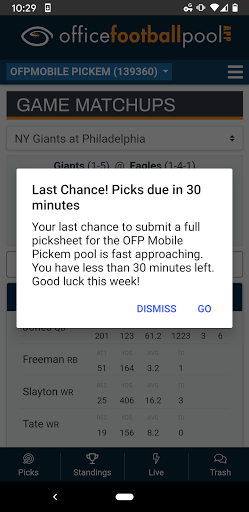 1) Last Chance Reminders: For certain types of Pickem pools, we will deliver a popup push notification within an hour of the pick deadline.
