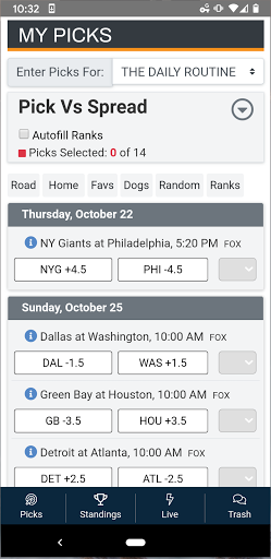 2) Pick sheets : Make your picks any time (before the deadline) on the go. The pick sheet helps validate your picks according to your game's configuration and settings, provides game-by-game analysis and statistics, and provides on-screen and emailed confirmations.