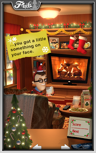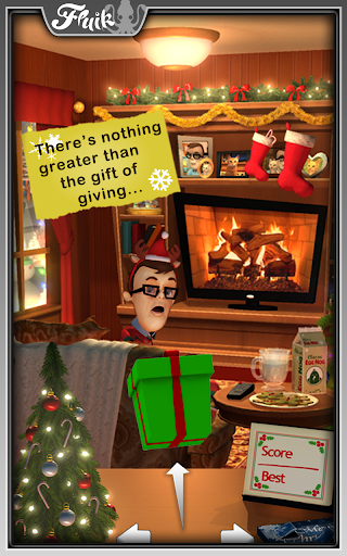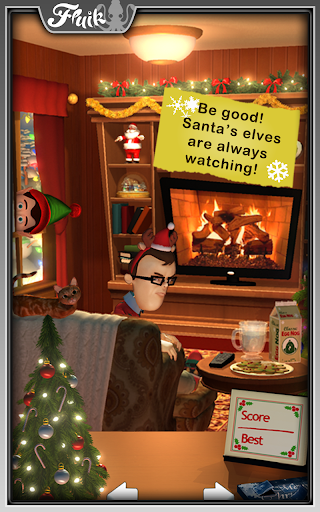 Complete challenges to unlock new items. Play the usual swipe-to-score game, or enjoy several mini games such as "Catch the Elf" and "Dance Santa Dance!" Shoot some stocking stuffer hoops, or really drive him crazy with some fancy channel surfing moves.