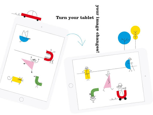 Surprise when you turn the tablet, the whole scene appears in portrait layout. Up and down become left and right. Another picture come to life with a light music created by the bunch of drawings moving before our eyes.