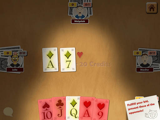 Bid the number of tricks you think you can take, then aim to take exactly that many - no more, no fewer. Bids are made sequentially, and in each new round, the next player in line starts bidding first. After a round, the next round starts with one card fewer.