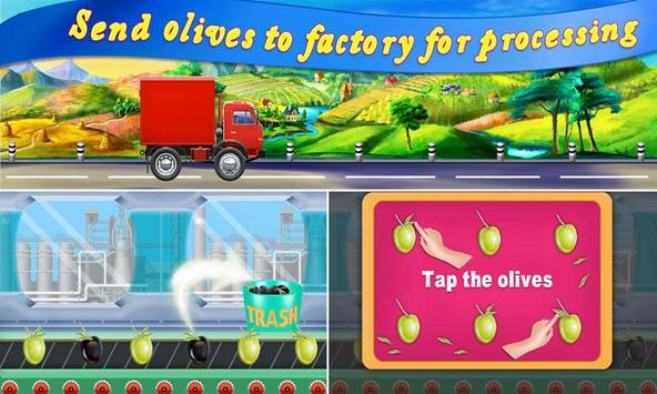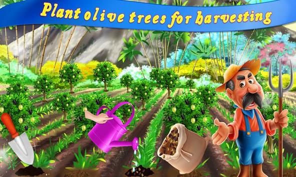 farm land with shovel, plant olive seeds and water them to grow olive tree farm. Take care of the garden and save tree from pesticides. Keep watering the tree until they grow up and grow olives. Cut weeds for lawn plants better growth and keep the dream garden clean. When the olives become ripe then get ready for harvest. Chop the ripe crop of olives from trees to complete the harvesting. Gather them in basket and transport it to cooking oil factory.