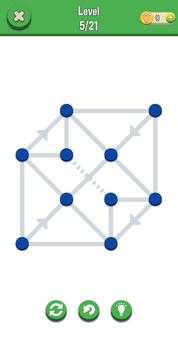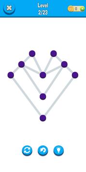 You can start from any of the dots, then connect along the lines. You have to connect dots using all the lines available. Some lines are one way only, for some you have to go twice. If you get stuck, hints are available. Hints are limited, so use them wisely. You can get hints by viewing ads.