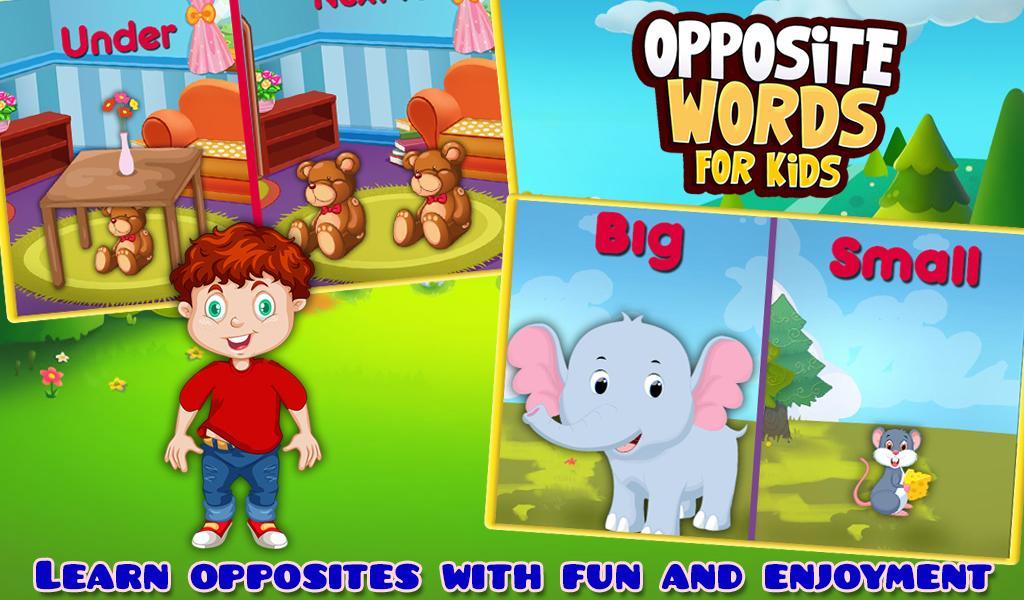You have probably successfully learnt lot of different words in our previous educational alphabet and word learning game for kids and toddlers. Now for the first time you will be learning the opposites or the Antonyms to those words. Start the game and watch the animated character of a particular word as well as of the opposite of that word. Learn tons of new words and the antonym to it with the voice combination which will help the kids to pronounce the words properly.