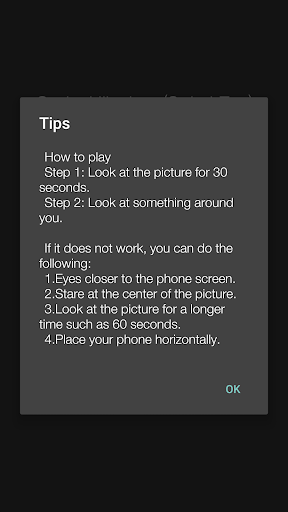Select one illusion then get ready and keep your mobile device (phone or tablet) about 25 cm in front of your eyes, then follow the instructions stated on the game, they will guide you on the process and shall provide tips on how to improve the visual effect.