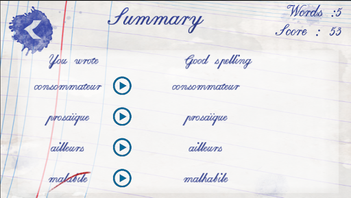The object of the game is really simple: write a maximum of words that will be dictated to you without making mistakes! More enchaînerez you the correct answers, the more you progress through the levels.