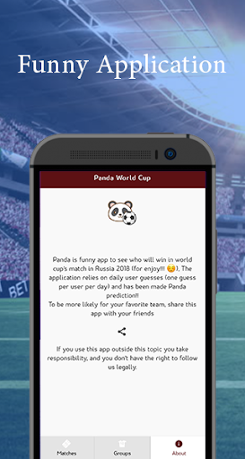 Panda is funny app to see who will win in world cup's match in Russia 2018 (for enjoy!!!), The application relies on daily user guesses (one guess per user per day) and has been made Panda prediction!!