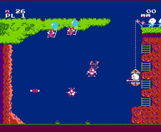 Mama Pig defends her home and rescues her piglets riding an elevator car moved by two pigs (controlled by the player with up and down), and uses a bow and arrow with slabs of meat against the balloon-riding wolves and their boss (the latter being pink in color while the former are red).