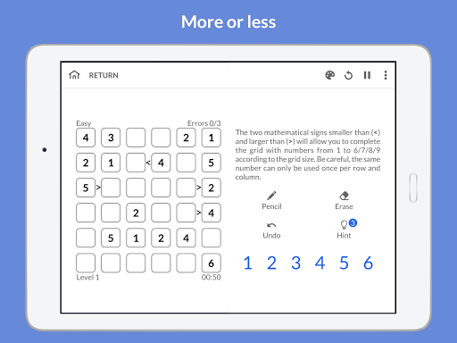 Paper Games groups several newspaper puzzles for free. Come sharpen your brain with Sudoku, Takuzu (also known as Binairo) and the classic Futoshiki! Our logic puzzles are aimed at a wide audience, from the youngest beginners to the greatest experts. The main objective? Provide you the best possible user experience by transforming the digital surface into a support