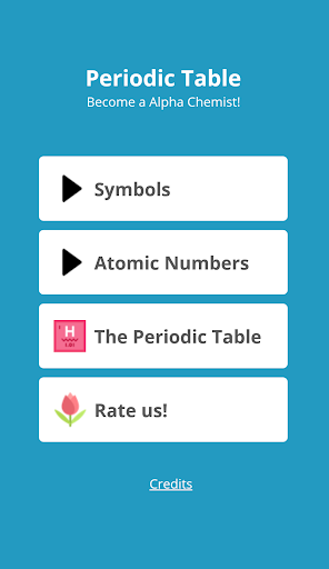 This app is simple, fun, and educational. I think the periodic table in the app should have more features. I look forward to that, as well as more quizzes based on the table. Learning the elements became much more interesting with your quizzes- thank you! Edit: I have a minor suggestion. The tag line shown on the main menu says, "Become a Alpha Chemist!" The 'a' should change to 'an', making the tag line grammatically correct ("Become an Alpha Chemist!"). Cheers.