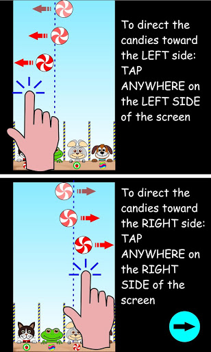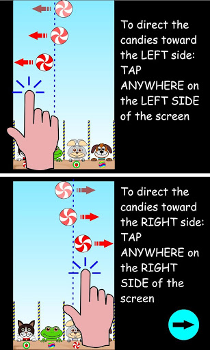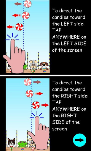 • To direct the candies toward the RIGHT side TAP ANYWHERE on the RIGHT SIDE of the screen.