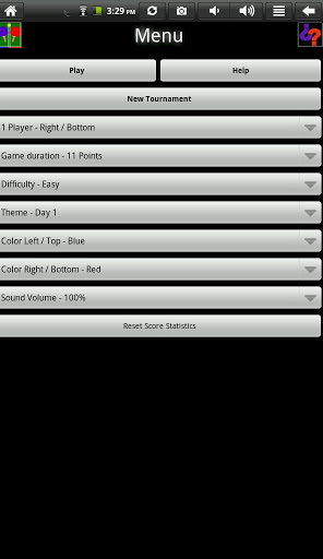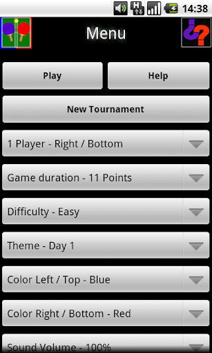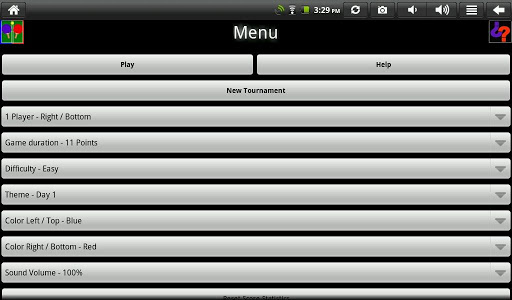 The game has: a tournament mode, 3 difficulty levels, 2 player mode, selectable themes and colors (with day and night lighting effects). The playing modes are: