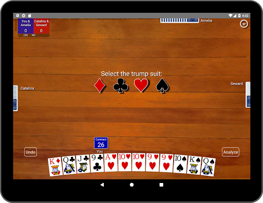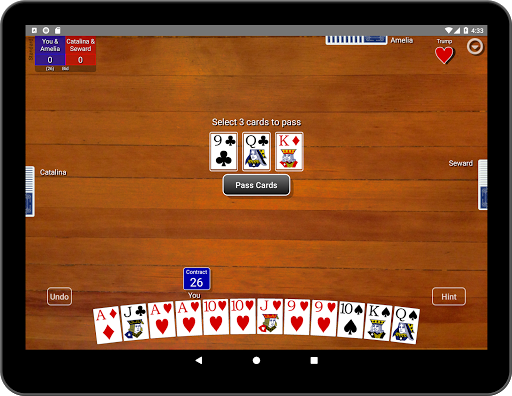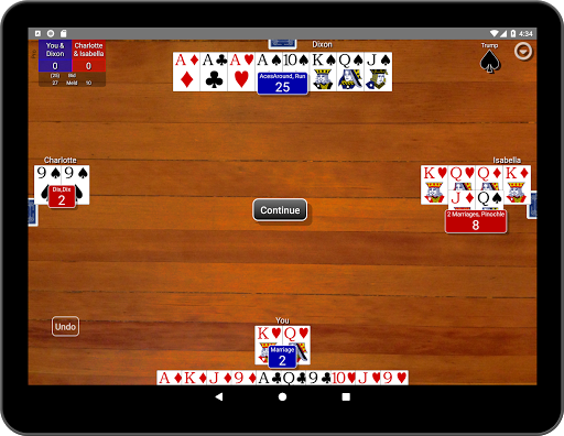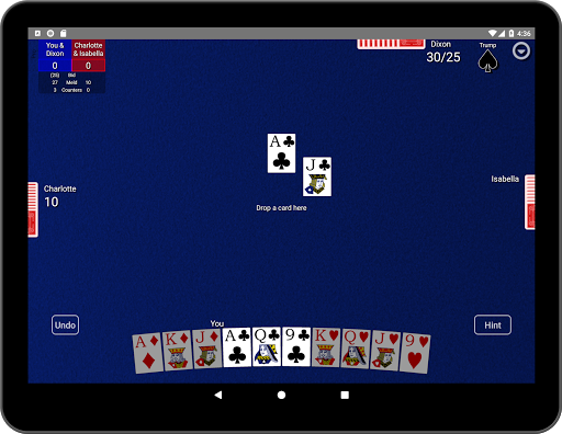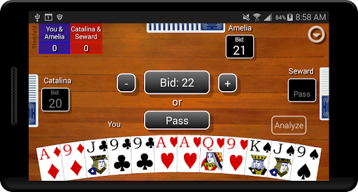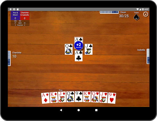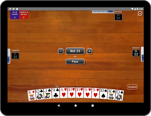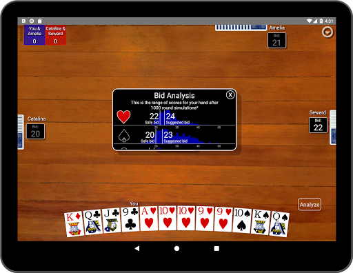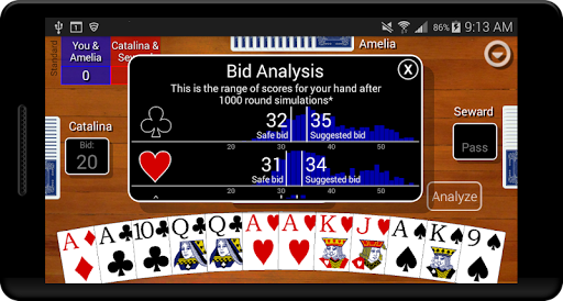 An analyze button can be turned on to help you evaluate your hand and pick a smart bid by simulating thousands of games and showing you likely round score outcomes. A hint button can be turned on to help you see what card the computer Pro player would play in your situation. Extensive statistics are kept for wins/losses, average contract, average meld, and average counters and success rate in making your bid.