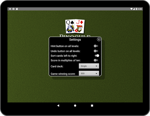Improve your skills and become a Pinochle pro! Play single or double deck games with three different difficulty levels so you can work your way up to playing like a pro. Pinochle Classic has many settings so you can configure the game to play with whichever rule variations you prefer including: single/double deck, scoring in multiples of ten, game winning score, minimum bid, passing cards count, hints, undo button, and adjustable game play speeds for slow, standard, or fast play.