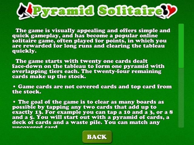• The goal of the game is to clear as many boards as possible by tapping any two cards that add up to exactly 13. For example you can tap a 10 and a 3, or a 8 and a 5. You will start out with a pyramid of cards, a deck of cards and a waste pile. You can match any uncovered card.