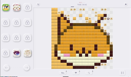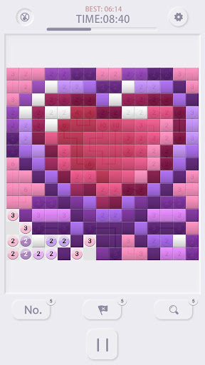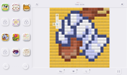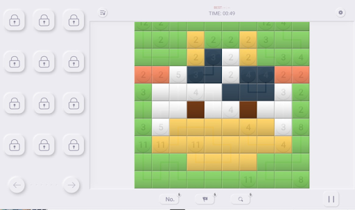 The rules of connecting squares are inspired by an article in a Japanese magazine in the early days. Each puzzle page consists of a grid containing clues in various places. Every clue, except for the 1’s, is half of a pair. The objective is to reveal a hidden art picture page by linking the pairs and painting the paths so that the number of squares in the path, including the squares at the ends, equals the value of the clues being linked together. Puzzle Paths may follow horizontal or vertical directions and are not allowed to cross other paths, depends on numbers, means it is a number pixel puzzle games in puzzle page.