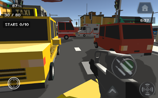 Pixel Smashy War is a FPS 3D shooter. Game contains MULTIPLAYER and SINGLEPLAYER. Singleplayer contains campaign, where you face hordes of zombies and you have to survive. You will have to collect stars or kill certain amount of enemies to pass the level. you can pick ammo and guns in the level. Stars also heal you. Levels contains a variety of vehicles - tanks, trucks, cars, police cars, helicopters and other gears ( all are destructible ).