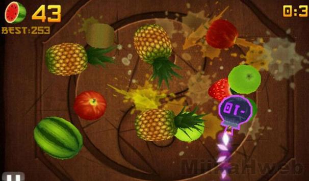 Pizza Ninja is a video game developed by 100 Game Zone. In Pizza Ninja, the player slices Pizza with a blade controlled via the touch screen. As the Pizza is thrown onto the screen, the player swipes their finger across the screen to create a slicing motion, attempting to slice the Pizza in half. Extra points are awarded for slicing multiple Pizzas with one swipe (called "combo"s) , and players can use additional fingers to make multiple slices simultaneously. Players must slice all Pizza ; if three Pizzas are missed, the game ends, (Unless Calligraphy Brush is used) but upon reaching scores that are multiples of one hundred (i.e. 100, 200, 300, etc.), the player will gain an extra life (unless they have not missed a piece of Pizza already). Bombs are occasionally thrown onto the screen, and will also end the game should the player slice them. (Unless Bomb deflects are used)