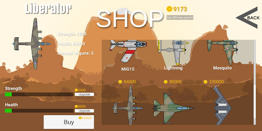 There are 9 planes created at your service. You can get them by collecting coins, witch are appearing in the game and destroying enemies. If you collect sufficient amount of money you will be able to buy a new plane or upgrade the one witch you are currently using. You can also receive 300 free coins by watching an ad.