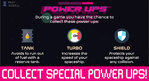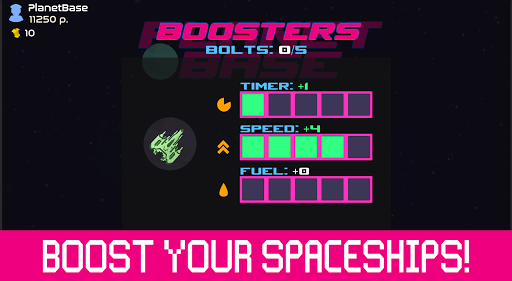 Now you can boost your spaceships: collect Bolts during a game and boost the parameters of each spaceship, choosing between timer, speed or fuel! To do so, go to the Garage and customize the stats of your favorite spaceship!